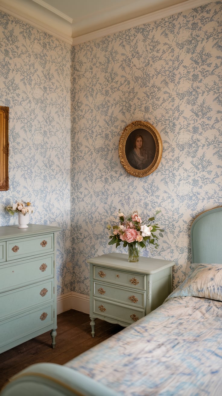 The furniture complements the wallpaper beautifully. The soft green dresser stands out against the floral backdrop, while the wooden pieces add a classic touch. Vintage furniture pieces tell their own stories and can create a cozy atmosphere.