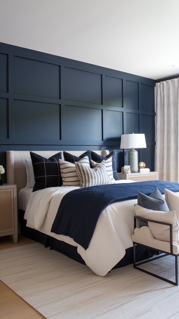 A bold navy accent wall can completely transform a bedroom, creating a striking focal point. This deep shade of blue adds depth and richness to the decor, making the room feel more inviting and cozy.