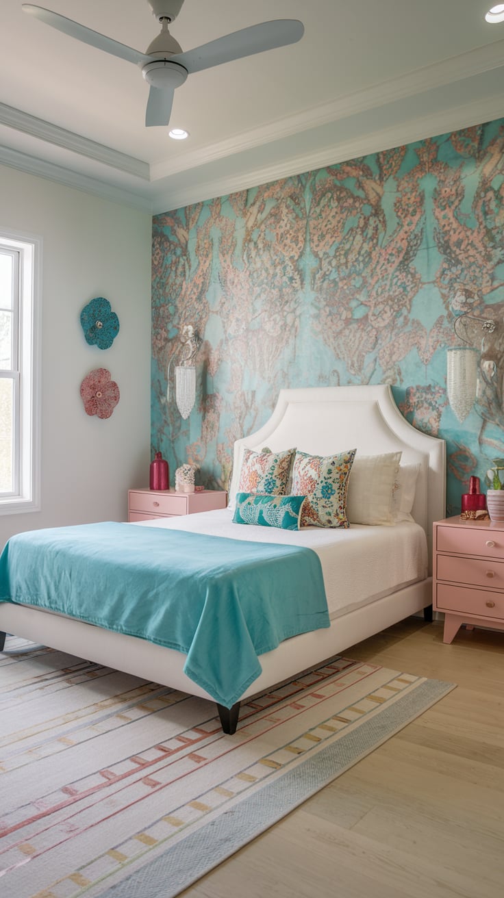 This bedroom beautifully combines turquoise and white to create a refreshing vibe. The walls feature a lovely floral pattern, making the space feel both cheerful and welcoming. The bright turquoise accents pop against the white backdrop, adding a splash of color that energizes the room.