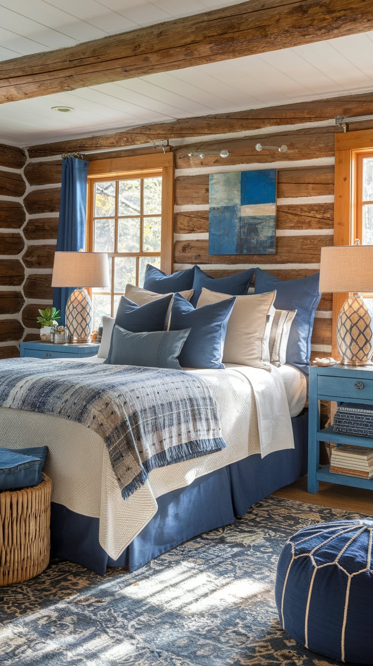 This cozy bedroom embodies the charm of a rustic cabin with a blue theme. The log walls provide a warm and inviting backdrop, while the blue accents create a refreshing contrast. A comfortable bed is at the center, adorned with soft pillows and a textured throw that invites relaxation. The nightstands flanking the bed feature stylish lamps, offering gentle illumination. Natural light streams through the window, enhancing the room’s earthy tones and cozy vibe. The woven basket and decorative pouf add practical storage and a touch of style. A patterned rug ties the room together, making it a perfect retreat for peaceful nights.