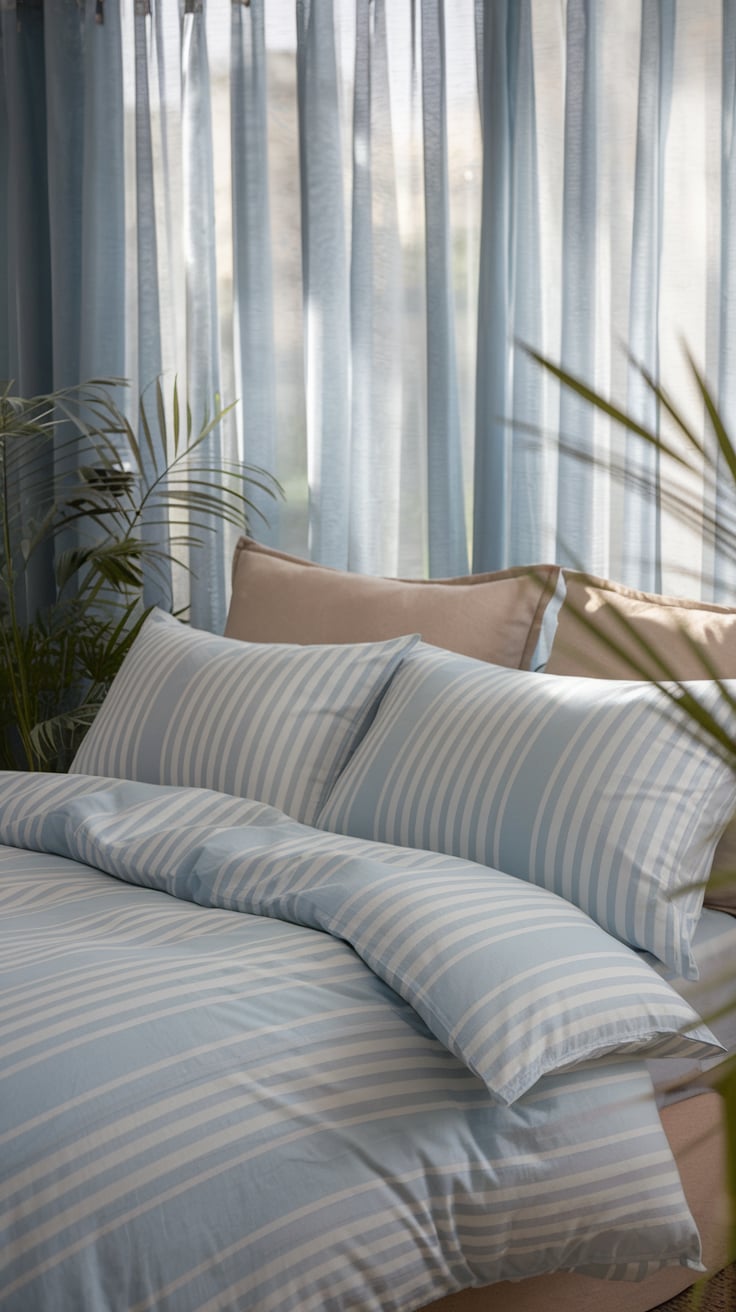This bedding set, featuring light blue and white stripes, brings a fresh and airy feel to the room. The patterns can create visual interest without being overwhelming. It’s an ideal choice for a cozy and inviting atmosphere.