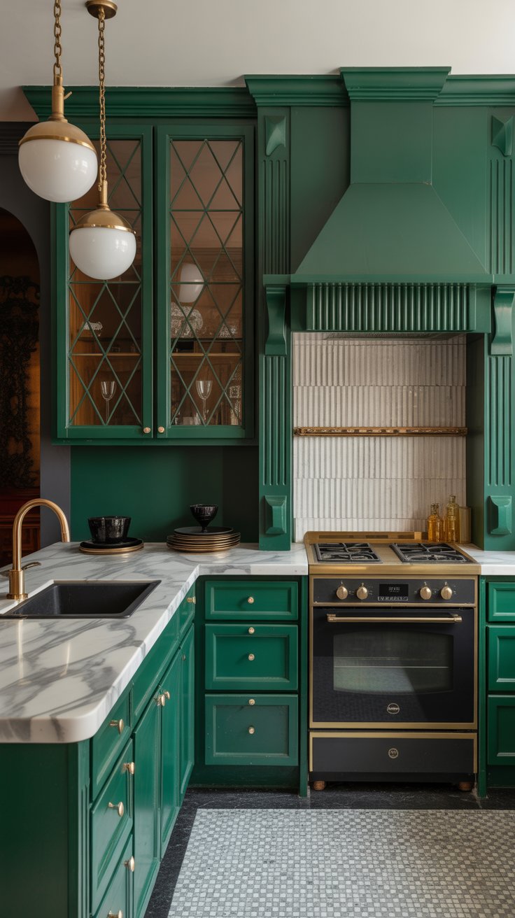 If you crave drama, this is your moment. Imagine emerald lacquered cabinetry with stepped Deco profiles and polished brass bar pulls that catch the light. The counters are creamy Calacatta-look marble with bold veining, carried up behind the range for a seamless glam hit.