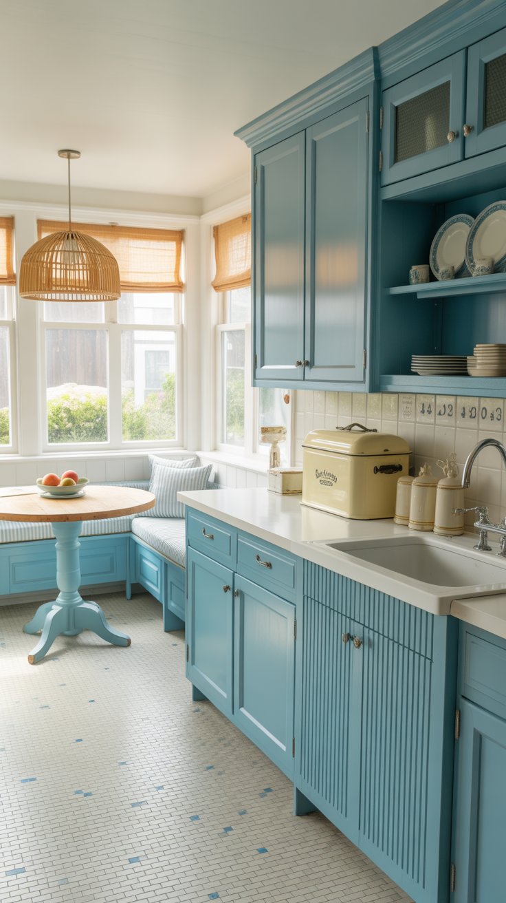 Here’s the breezy, sun-washed take that makes weekday mornings feel like a holiday. Start with robin’s-egg blue cabinets in a satin finish, paired with nickel latch hardware for a subtle shimmer. The countertops are white quartz for ease, but the vibe is all vintage, thanks to a fluted drainboard sink straight out of the era.
