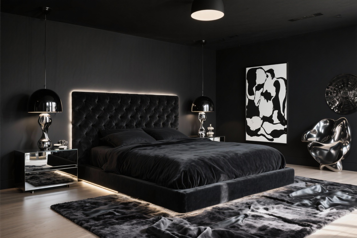 This room is pure luxe—like a late-night cocktail lounge turned bedroom. Start with matte black walls and a tall channel-tufted velvet headboard in deep onyx or jet.