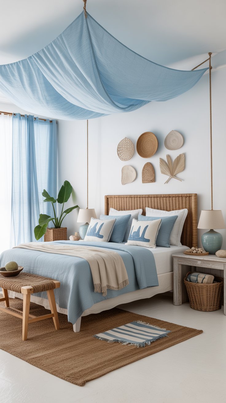 Finish with a striped throw, a woven bench at the foot of the bed, and a bowl of collected stones or sea glass on the nightstand. It feels like waking up on holiday—every single day.