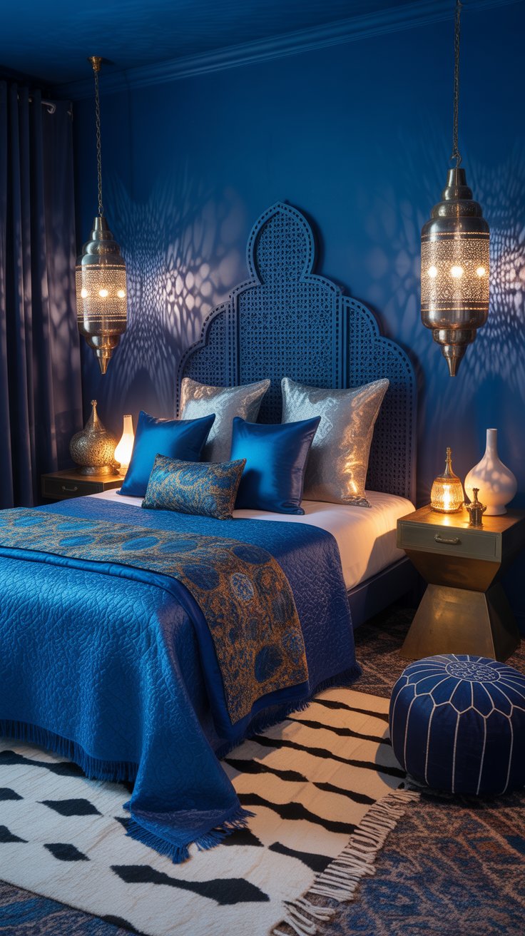 This one leans dramatic and decadent. Think jewel-toned blues—sapphire, lapis, and peacock—layered with metallic accents. Start with a deep navy wall behind a carved arched headboard, then layer Moroccan wedding blankets, patterned quilts, and silky cushions that shimmer just a little.