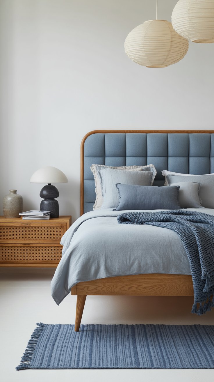 Clean lines meet artisanal soul. Start with soft white walls and pale wood floors, then layer dusty blue and slate accents for an ultra-calming space. A simple oak bed with rounded edges and a tufted blue linen headboard anchors the room.