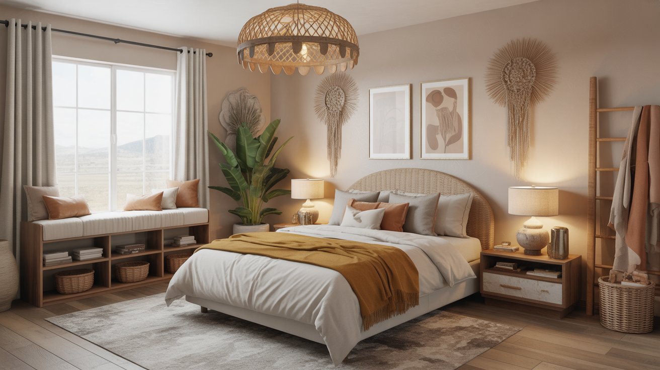 Below are 5 completely different Boho Western bedroom designs. Each one is a full look—from color palette and furniture to textiles and lighting—so you can pick your favorite and run with it.