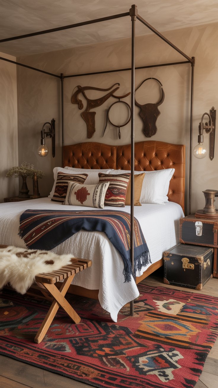 Choose a tufted leather headboard with slightly cracked patina. Layer crisp white linen sheets with a navy serape blanket and mixed kilim cushions in geometric patterns. A black metal canopy frame adds structure without feeling heavy.