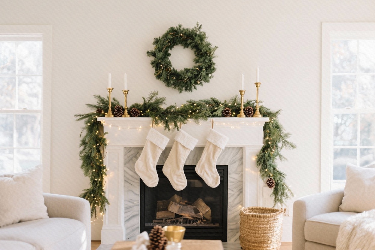 This one feels like stepping into a quiet winter morning. Keep the palette ultra-clean: soft whites, creamy ivory, and pale wood. Drape a fluffy, white faux garland across the mantle, then tuck in wisps of eucalyptus for a hint of sage.