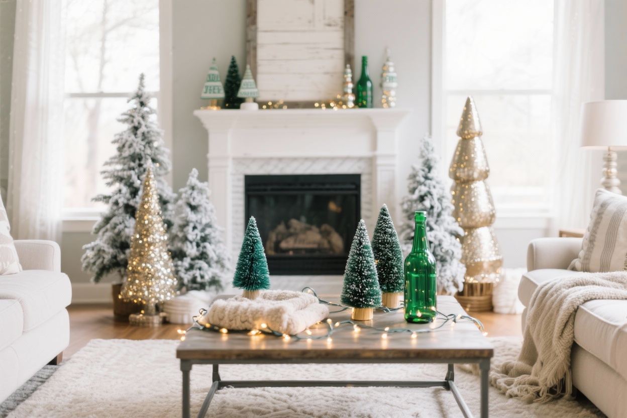 This one’s dreamy and whimsical. Picture a soft pastel palette—blush, mint, and champagne—set in a cozy parlor with a tufted settee and lace curtains. Your tree wears paper doily snowflakes you make in minutes, pastel ball ornaments, and pearlescent beads. A length of sheer ribbon cascades like tulle down the branches.