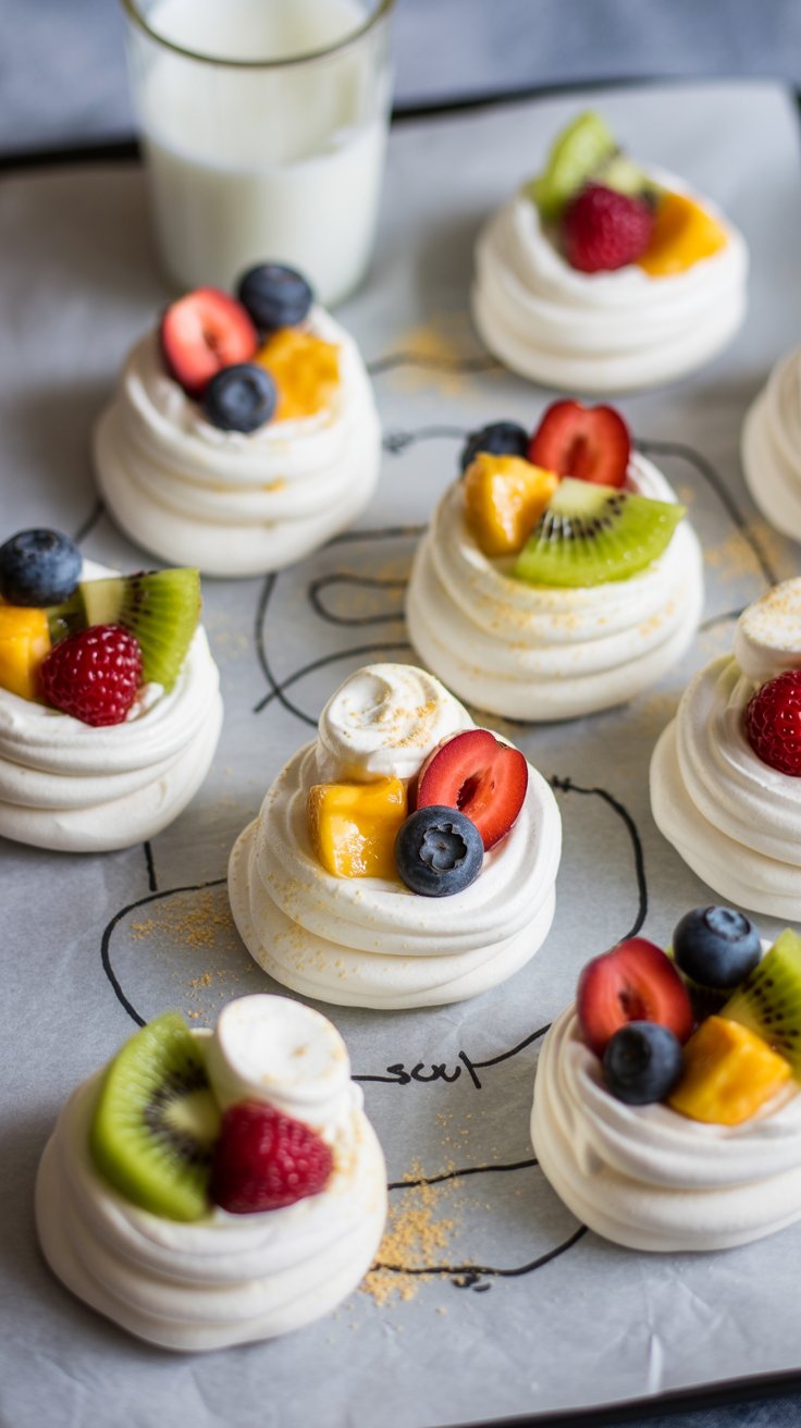 These are airy, elegant, and secretly forgiving. The crisp meringue shell gives way to marshmallowy centers, topped with tangy cream and juicy fruit. They’re showstoppers that also happen to be naturally gluten-free.