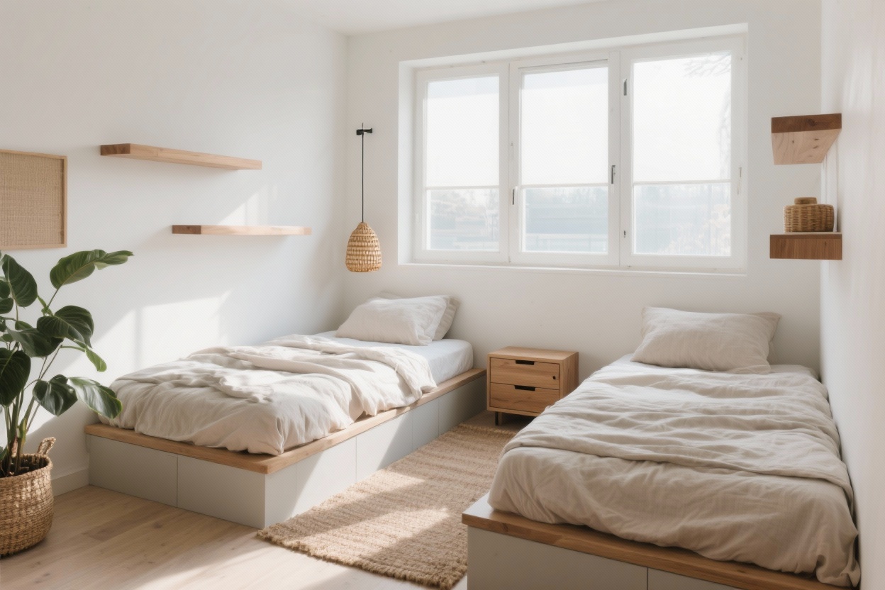 This design blends Scandi minimalism with flexible sleeping options. Two wood-framed daybeds sit in an L-shape—one along the long wall, one under the window—so daytime seating turns into nighttime sleeping.