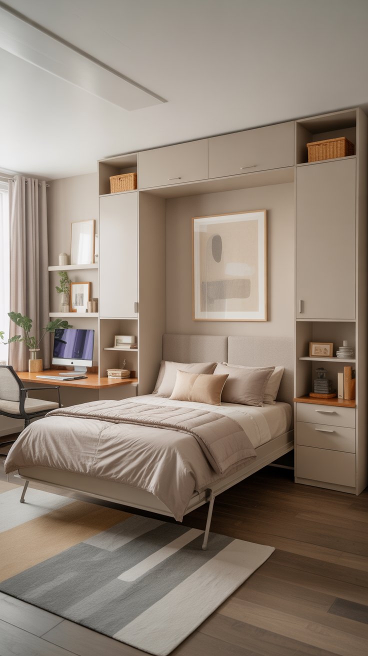 This one’s for tiny rooms that need maximum flexibility. The star is a Murphy bed that flips up to reveal a desk and storage. When the bed disappears, the room becomes a full-fledged office. When it’s down, it’s a serene bedroom with zero compromise.