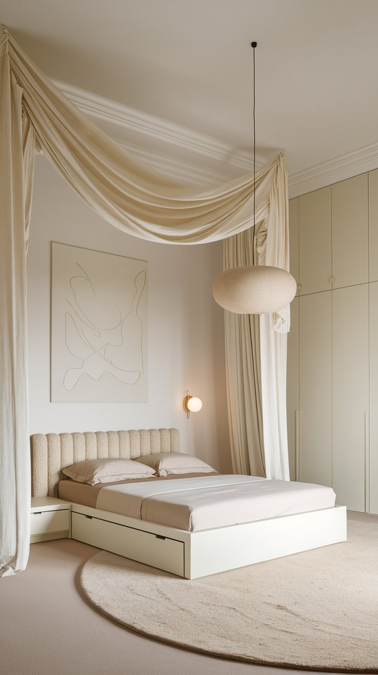 The palette stays tight: ivory, sand, and pale oat. Add a single sculptural statement—maybe a curved plaster pendant—to float over the bed like a cloud. Keep surfaces clean with floating nightstands so you can actually see the floor (instant spaciousness).