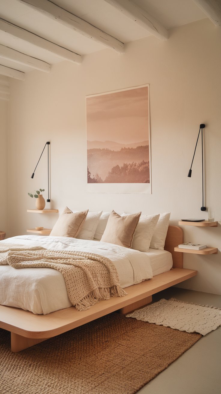 Keep clutter invisible. A built-in niche with sliding shoji-style doors holds bedtime essentials. For art, choose one wabi-sabi ink sketch or a small arrangement of dried grasses. Ground the space with a wool-blend flat rug in clay or sand.