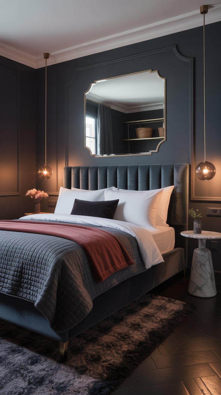 If you love a dramatic, date-night vibe, this one’s for you. Picture deep charcoal walls, a touch of brass, and lush velvet that makes the room feel like a high-end lounge.