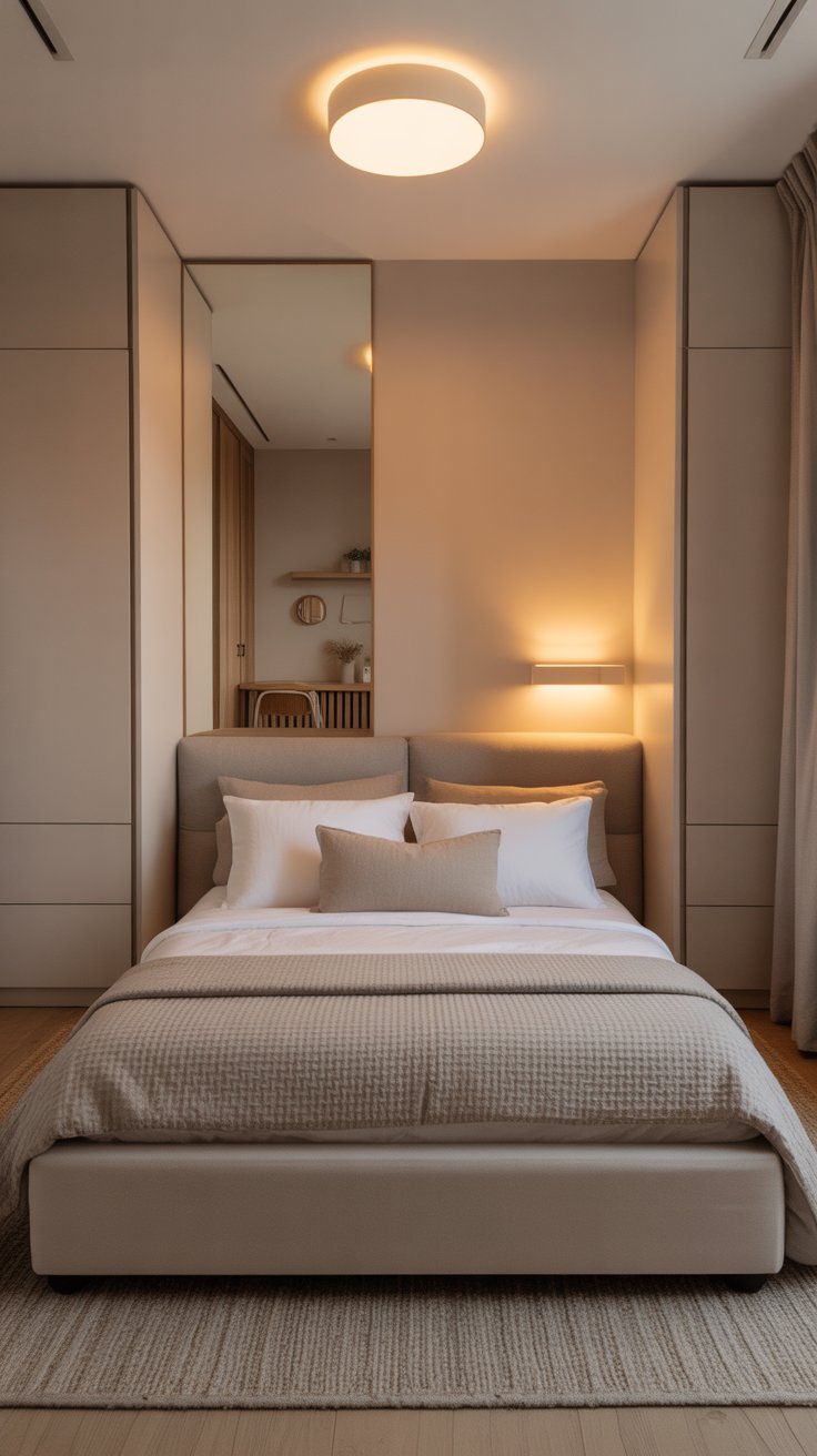 At the foot of the bed, position a narrow upholstered bench with hidden storage. Opposite, carve out a tiny living zone: a 26–30-inch wall-mounted desk that doubles as a vanity, paired with a slim armless chair that tucks underneath. Above the desk, hang a frameless mirror to bounce light and make the room read larger.