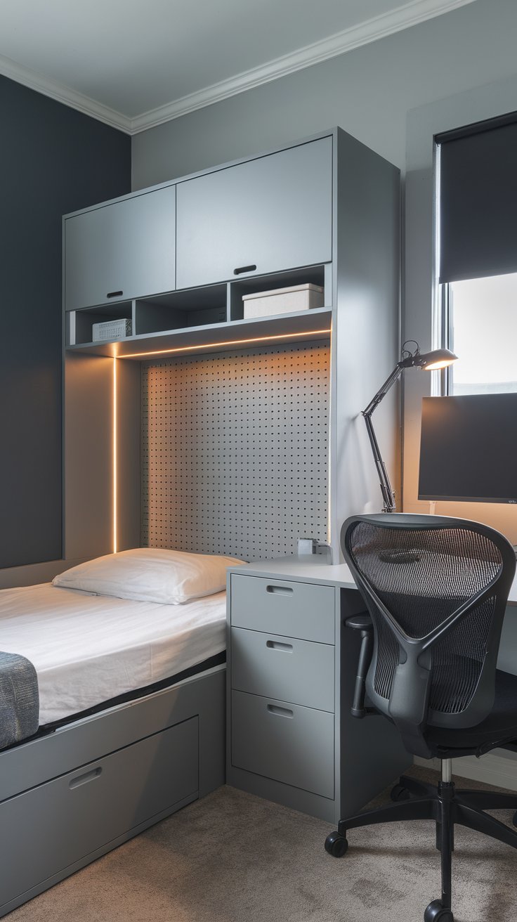 - Hero pieces: Storage headboard bed, floating desk, metal pegboard, compact ergonomic chair.
