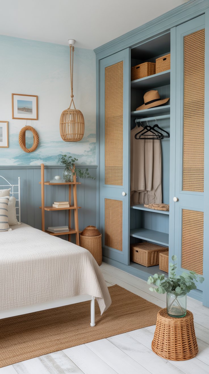 5. Coastal Compact: Built-In Wardrobe With Cane Panels and Breezy Blues