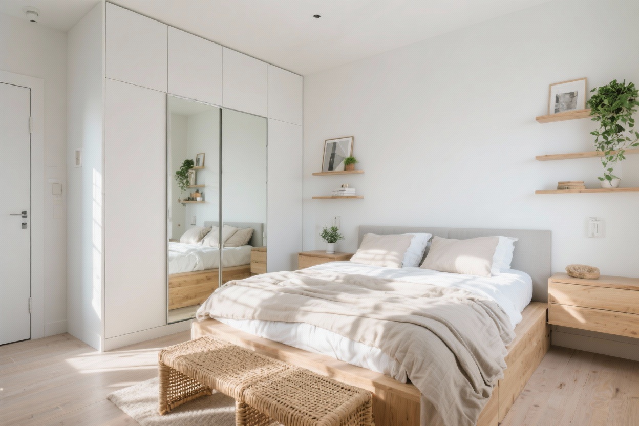 1. Scandinavian Cloud: Soft Neutrals, Slimline Wardrobe, and Floating Everything