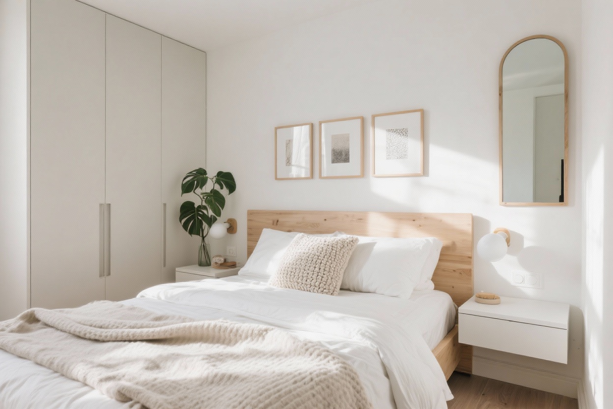 At the center, a low-profile platform bed in pale oak grounds the space. Dress it in stone-washed linen—cloud white sheets, a greige duvet, and a single lumbar pillow for shape. Skip the headboard and paint a rounded half-moon arch in warm putty behind the bed for quiet drama that doubles as a visual headboard.