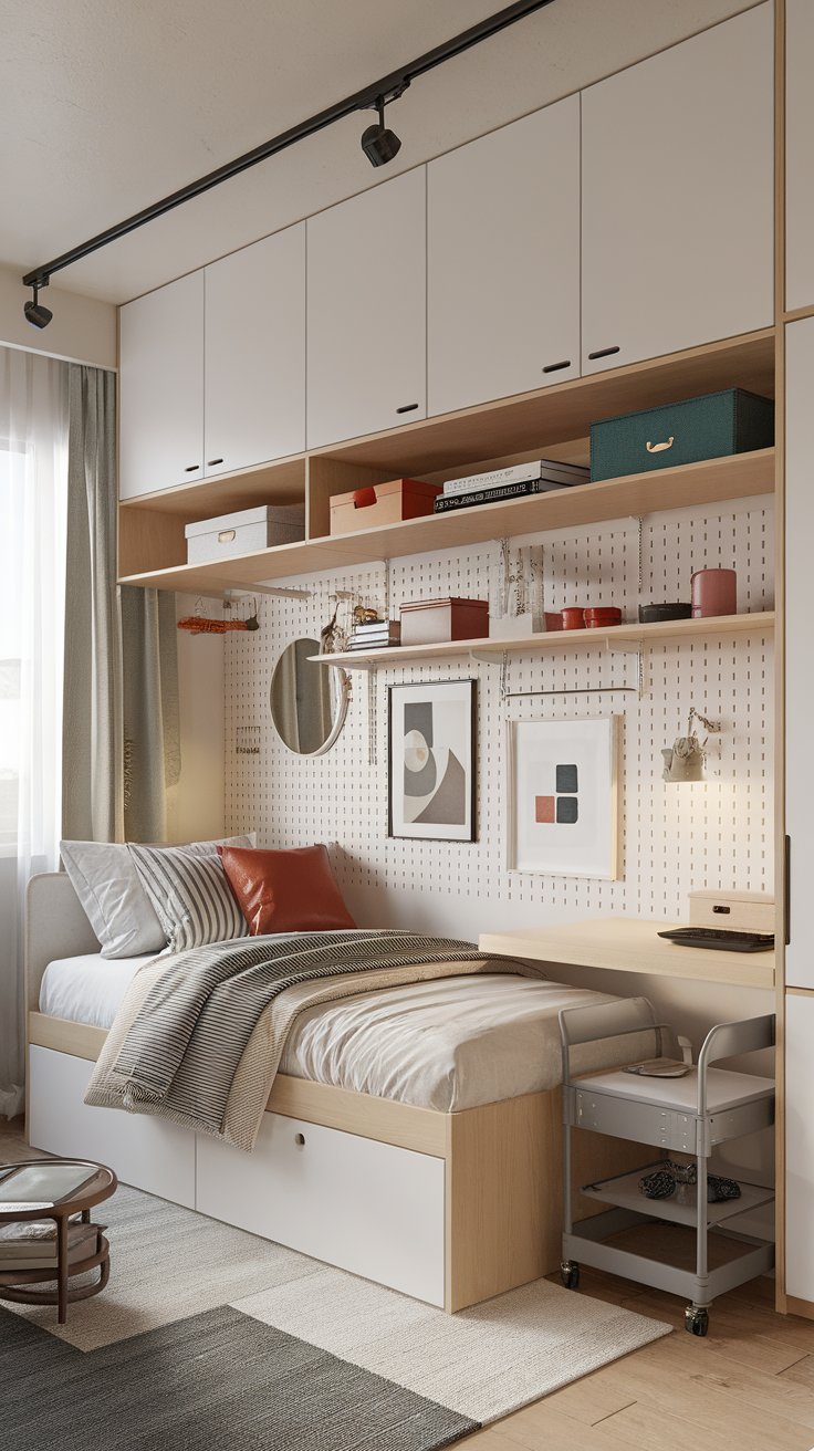 Mount a grid of pegboard or slatted wood panels on one wall to serve as a “command center” for shelves, hooks, and baskets that can move as your needs change. Keep the furniture footprint narrow and vertical—nothing bloated or heavy.