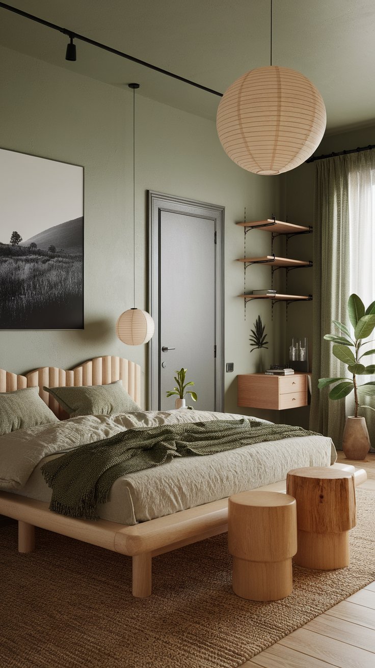 Flank the bed with cylindrical wood stools as nightstands—simple and sculptural. Add paper lantern pendant lights on each side to keep things soft and diffused. For art, go large-scale: a black-and-white landscape photograph or a serene, minimalist botanical print.