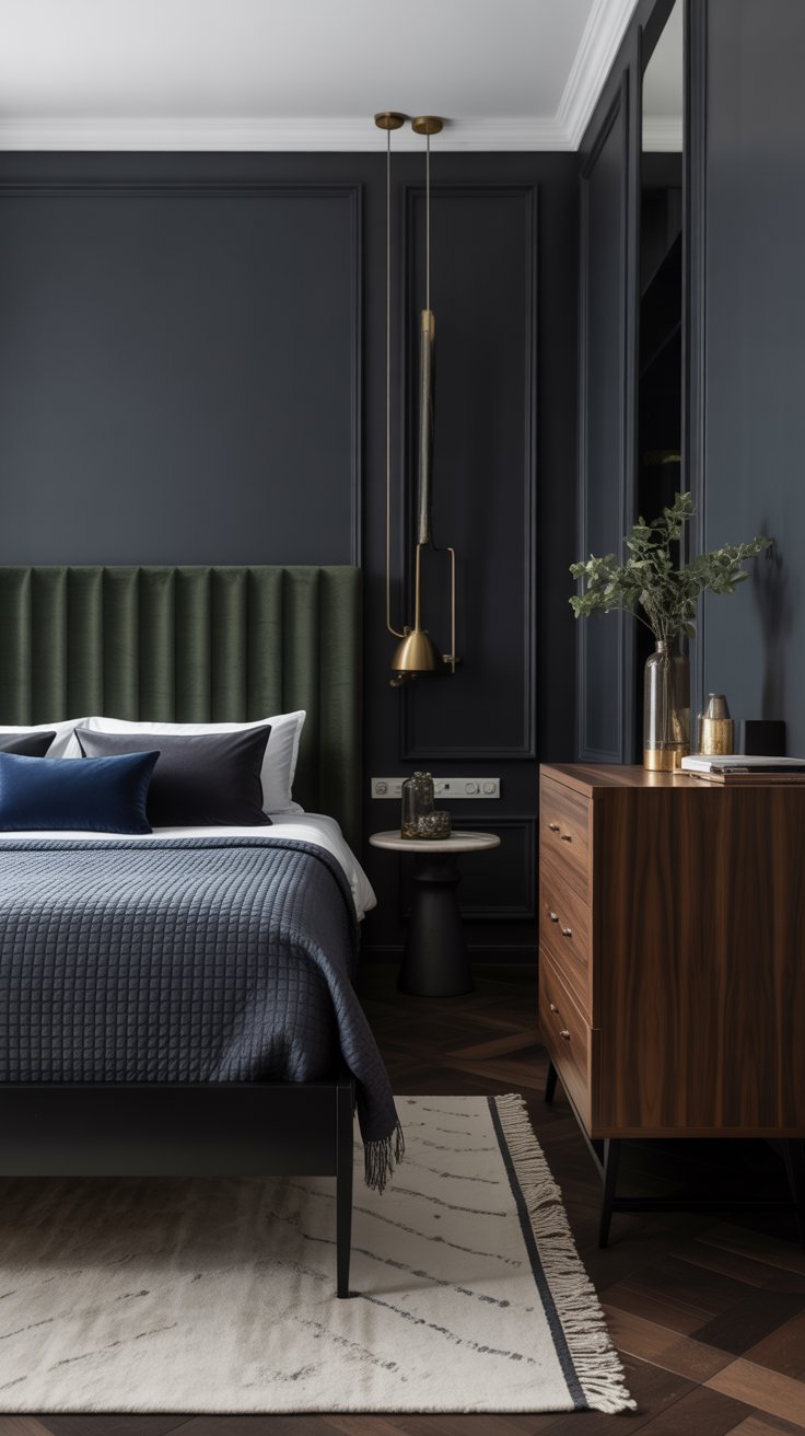 Paint the walls a deep **slate charcoal** and keep the ceiling bright white. Choose a **channel-tufted velvet headboard** in forest green or midnight blue—lush, tailored, and timeless. Use **wall-mounted swing lamps** in brass to free up your nightstands.