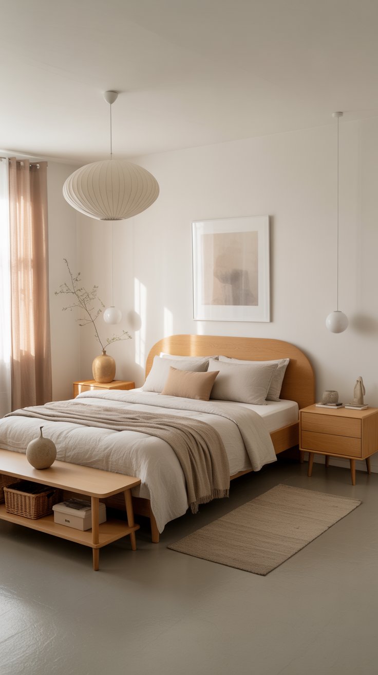 • Key Furniture: Rounded wooden bed, floating bedside shelves, a compact dresser with tapered legs.