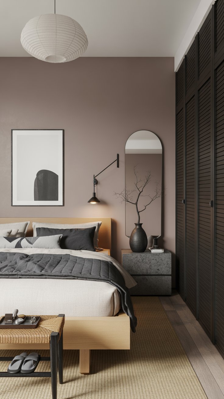 Walls go soft mushroom or warm greige. The bed is a low tatami-style platform in light oak, paired with off-white linen and a charcoal quilt folded neatly at the foot. Keep the palette restrained and intentional.