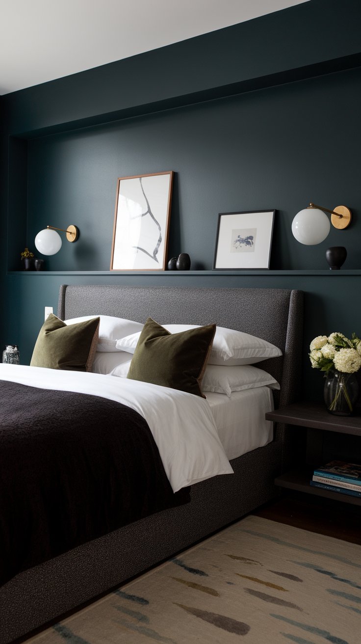 Paint the room a deep moody blue-green to create cocoon vibes. Set a low-profile upholstered bed in textured charcoal against it. On the ledge: two identical globe sconces wired in above each pillow, a pair of framed prints leaning casually, and matching ceramic catch-alls.
