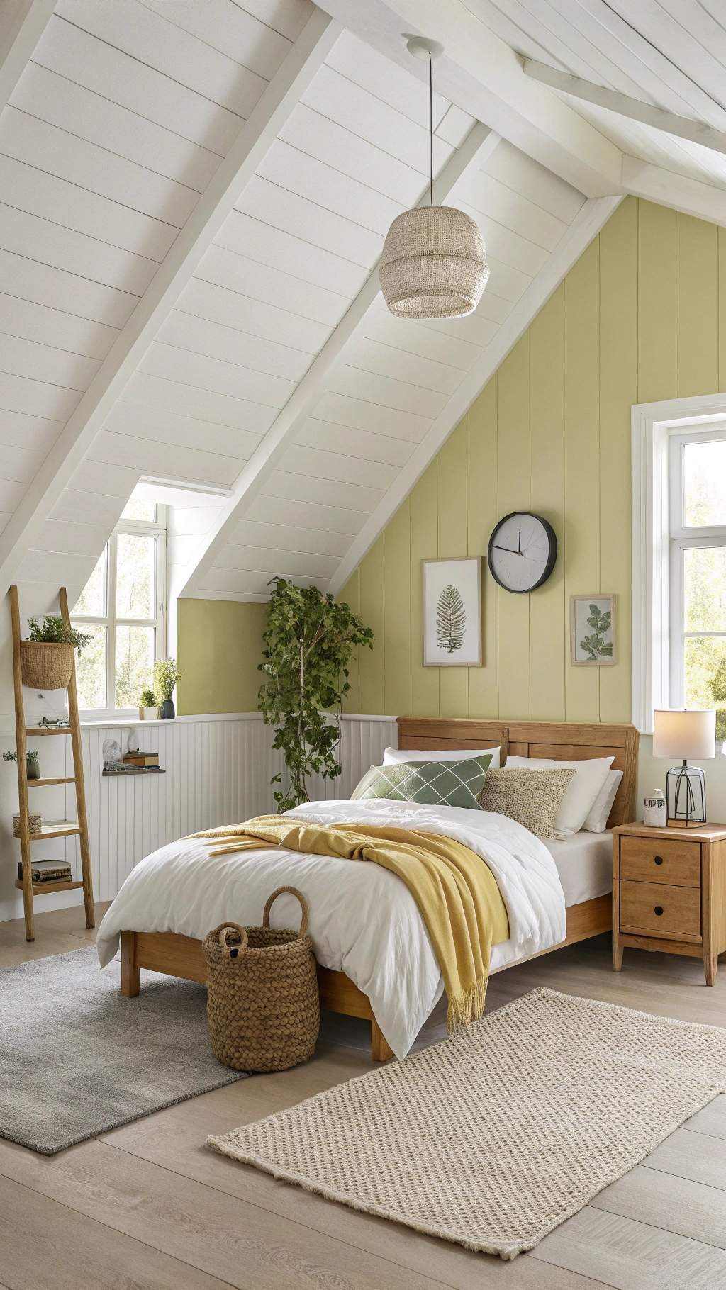 Want a space that looks like it inhales sunshine? Paint the walls a soft buttercream with a barely-there yellow undertone. Keep the ceiling bright white to reflect light, and add a sage green accent on the headboard wall or inside a shallow alcove to ground the bed.