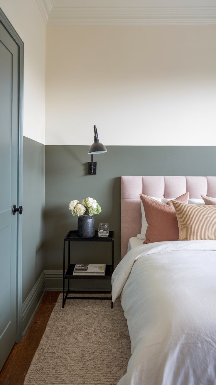 This is the “wow” moment in a tiny package. Split the wall horizontally with a two-tone paint treatment: a muted, mid-tone shade on the bottom (think clay rose, muted olive, or slate blue) and a soft off-white on top. Use painter’s tape to create a sharp line around 36–42 inches from the floor, depending on your headboard height.