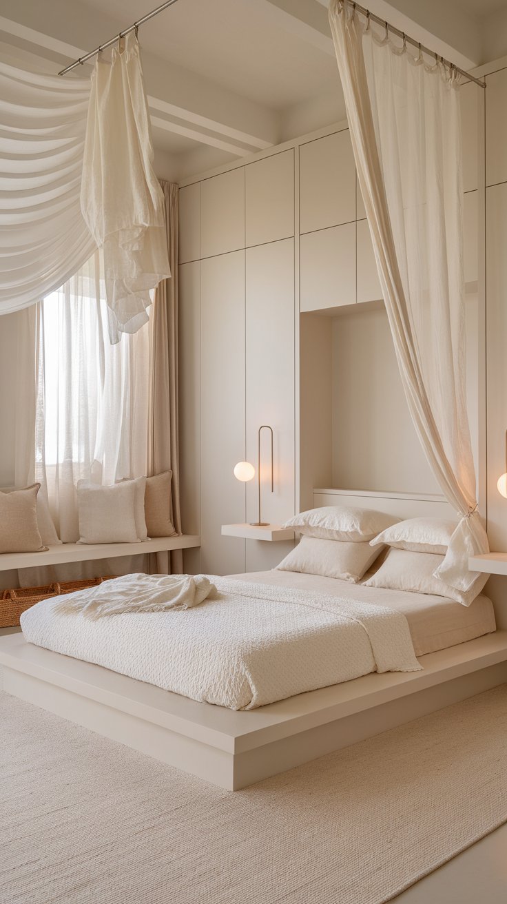 This room is all about calm, clean simplicity that looks effortless. Picture a soft white envelope — matte white walls, sheer ivory curtains, and a pale cream rug that feels like stepping onto a cloud.