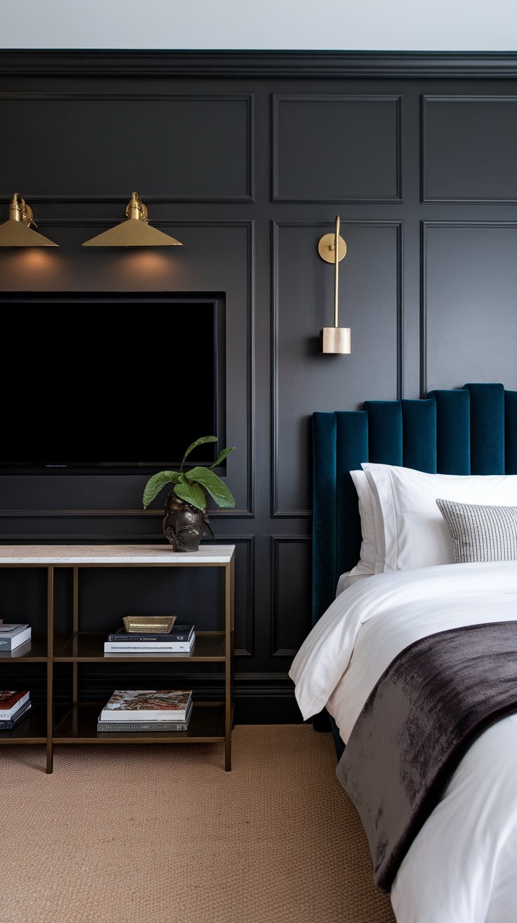 Think small room, big drama. The wall behind the TV goes charcoal paint with classic panel moulding boxes to add depth. The TV sits centered in the largest panel so it looks like a piece of art—and when it’s off, the matte dark finish minimizes glare.