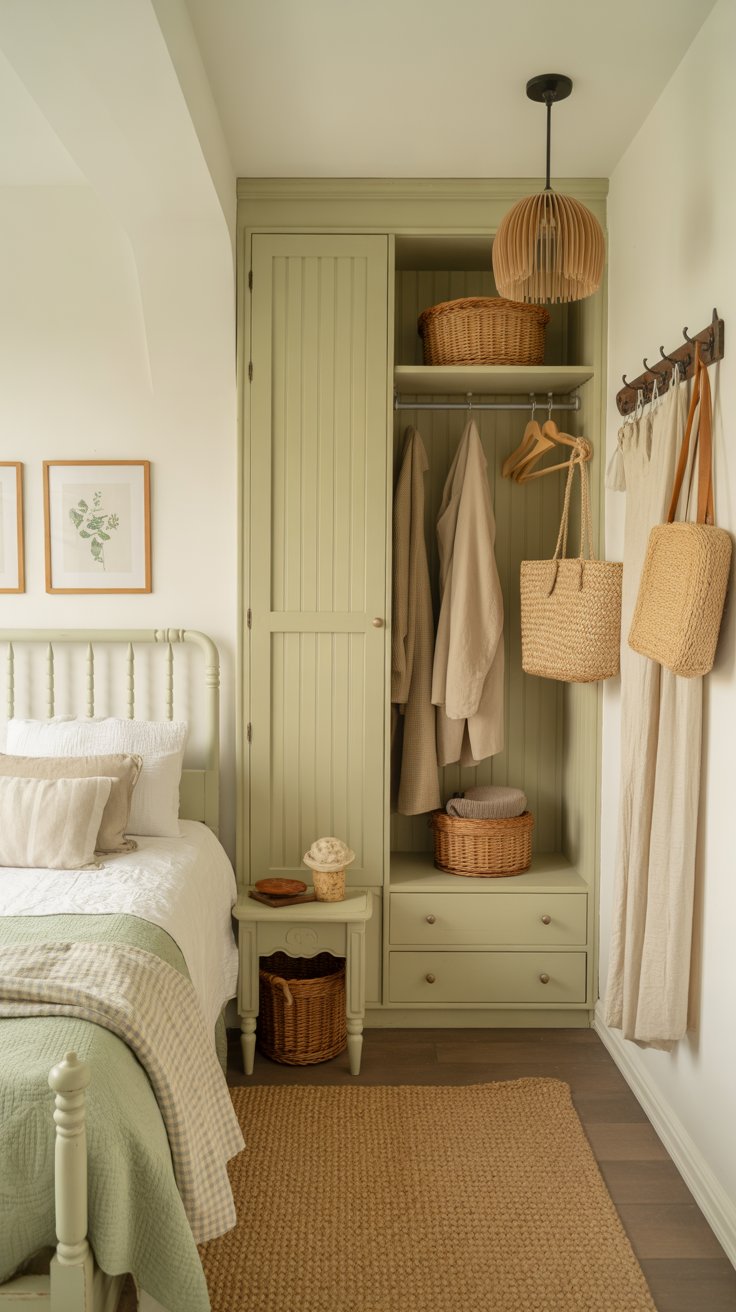 4. Cottage Cozy: Shaker Wardrobe Nook With Soft Sage and Woven Layers