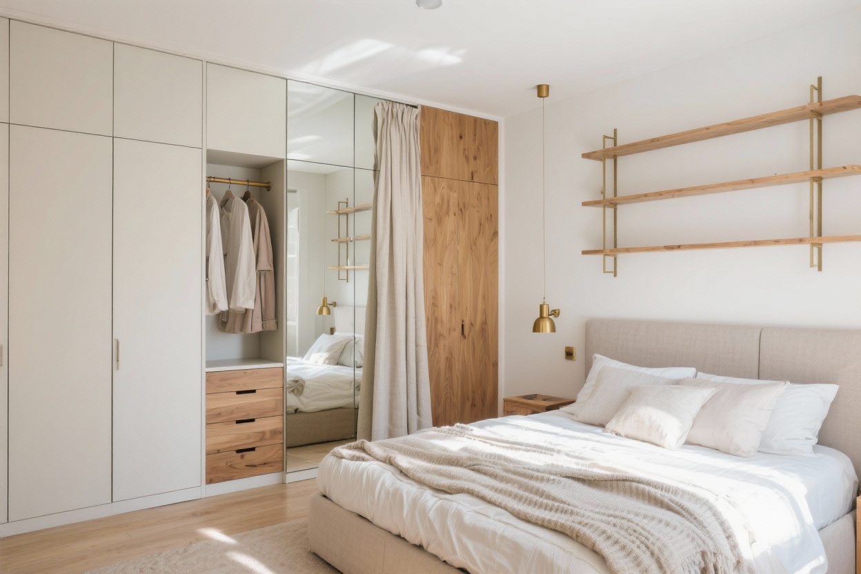 • Wardrobe placement: Opposite the window to bounce daylight; across from the bed for depth.