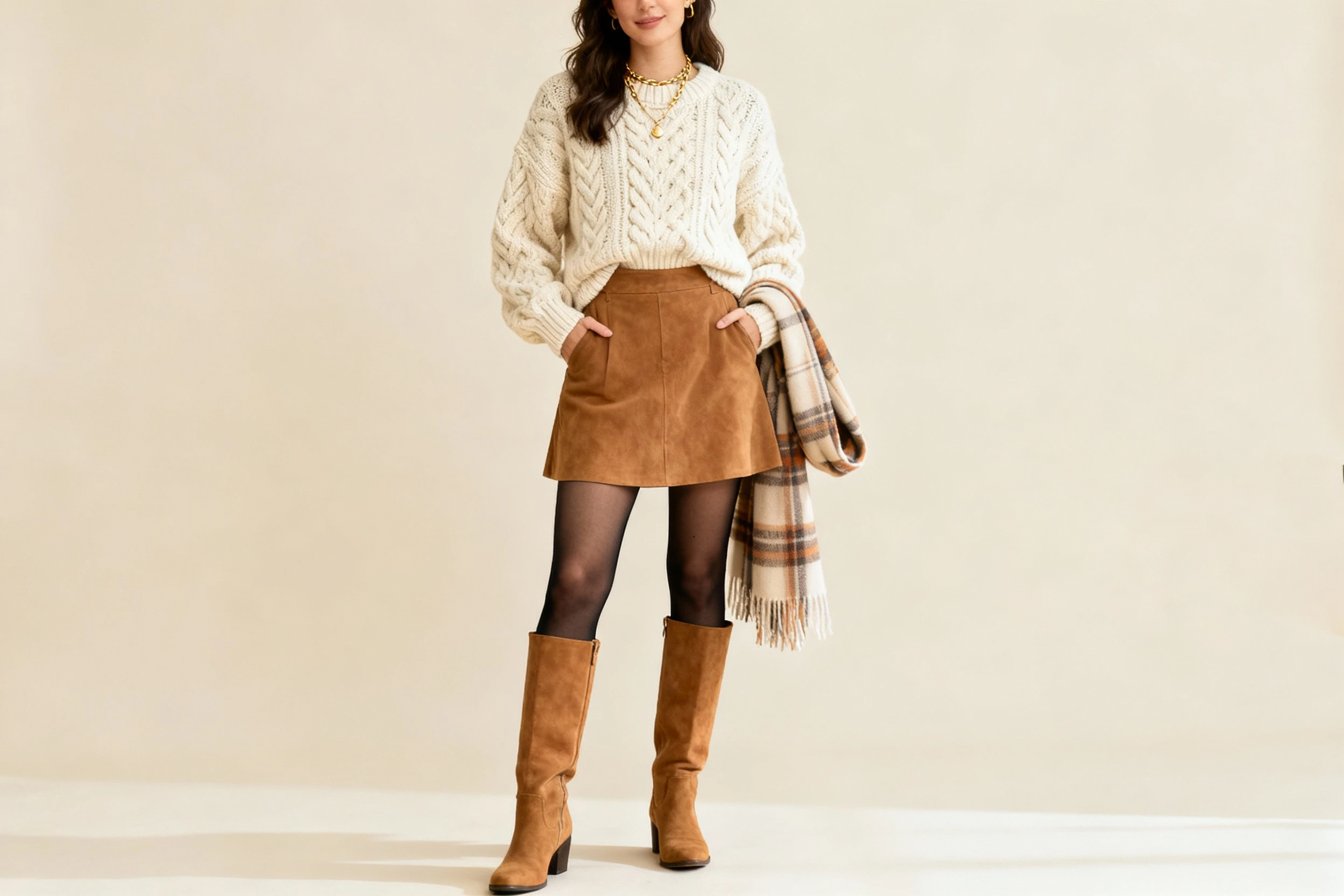 Wear this for family dinners, Friendsgiving, or office potlucks that lean dressy. Swap knee-high boots for chunky chelsea boots if you’ll be on your feet a lot. Want a pop? Add a berry lip or plaid scarf for instant holiday charm.