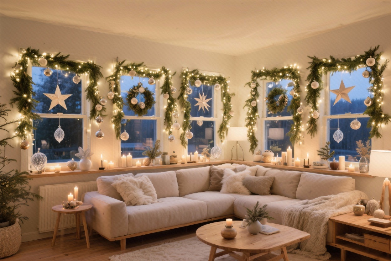 Keep the palette soft: white, pale gray, and bleached wood. Add a slim birch branch garland across the window frame—thread it with micro warm-white fairy lights for a soft glow. On the sill, line up white ceramic houses lit by LED tea lights for that cozy village vibe.