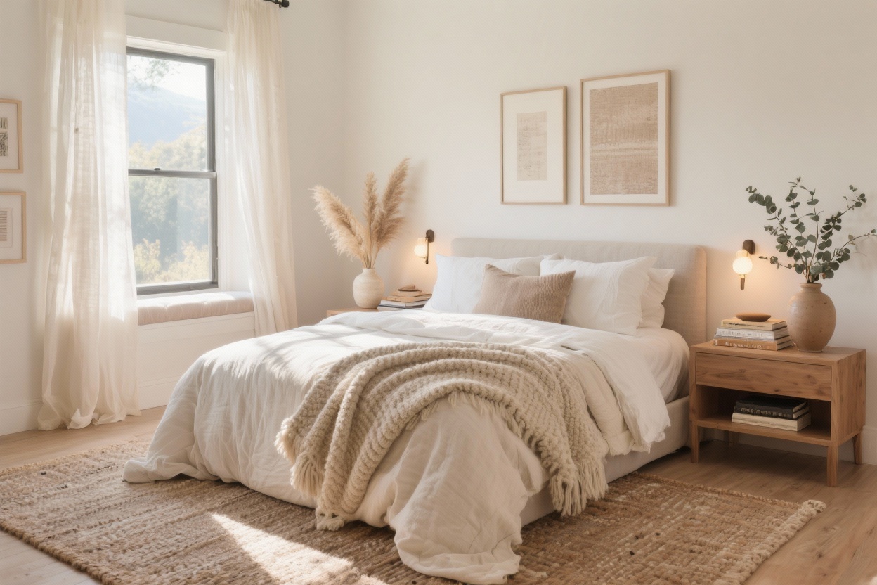 On the walls, hang one large abstract canvas in beige tones rather than multiple frames. Use sheer flax curtains wall-to-wall to soften light. A jute-and-wool rug grounds everything with gentle texture.