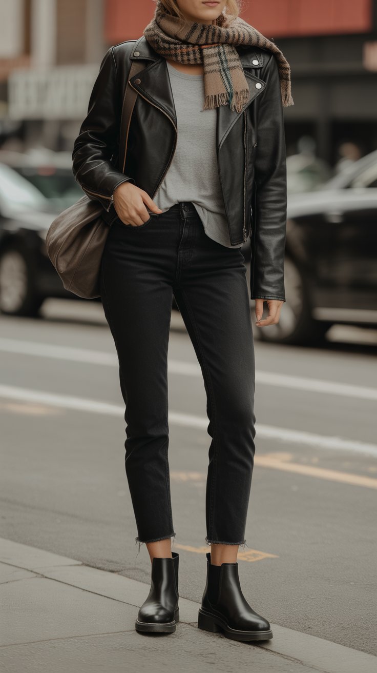 Think weekend walks and late-afternoon plans that turn into dinner. A leather jacket with Chelsea boots is timeless, but the fall textures make it feel fresh—denim, knit, leather, done. It’s minimal, versatile, and secretly warm.