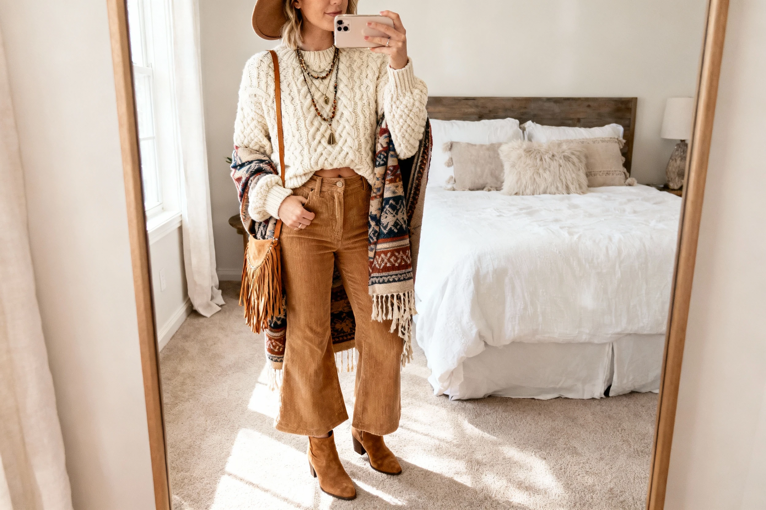 Who says boho can’t be polished? A shearling or faux-shearling vest layered over corduroy turns a tailored set into a warm, artsy statement. It’s office-friendly with personality, and it transitions straight to post-work drinks without missing a beat.
