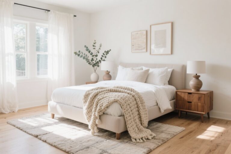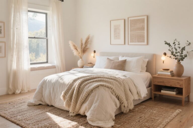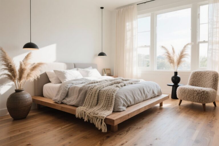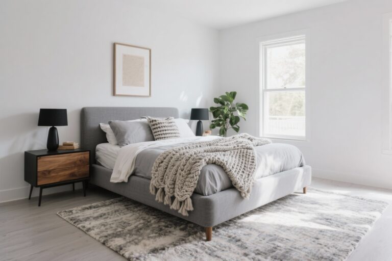 Keep surfaces simple: a raw pine bench at the foot, crisp white percale sheets, and a smoky charcoal quilt folded neatly. Lighting is key—choose matte black sconces mounted on either side of the bed with warm Edison bulbs.