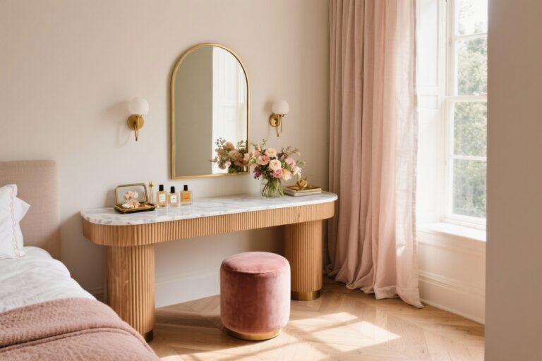 Choose a white-painted wooden bed with a curved headboard, then add gingham accent pillows and a woven jute rug. Keep furniture slightly curvy: a scalloped-edge nightstand and a petite, turned-leg vanity in antique white.