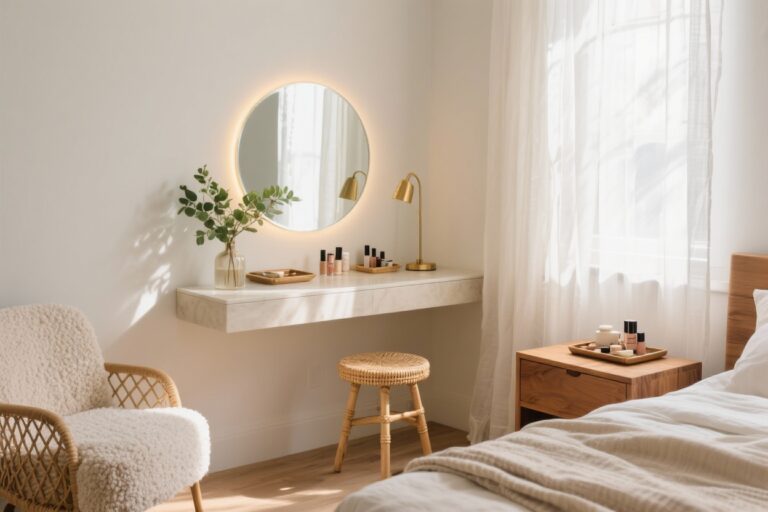 - Lighting: Linen drum shade overhead and glass-base lamps for glow.