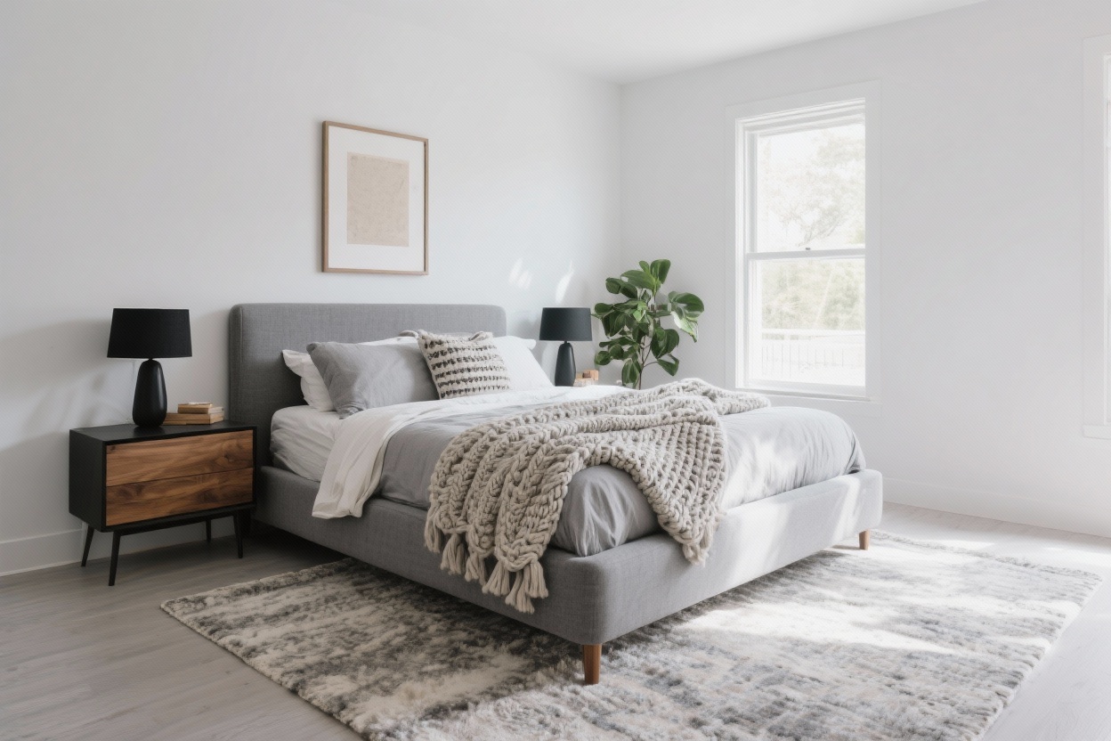 Choose a low-profile platform bed in walnut or acacia and top it with stone-gray linen bedding. Add black metal sconces for a clean, modern contrast and anchor the space with a wool rug in muted taupe for softness underfoot.