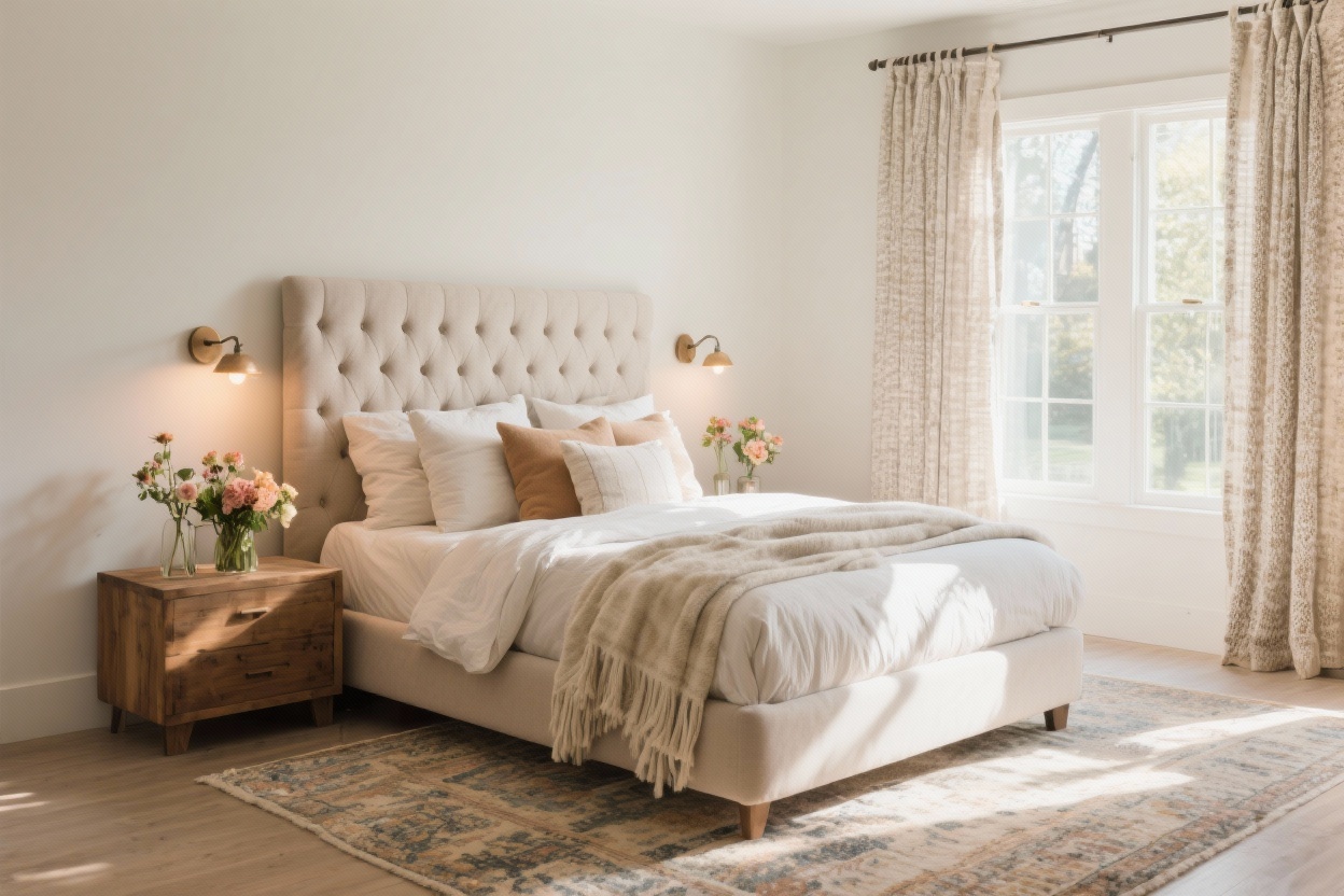 Elegant without trying too hard. Paint walls a **soft greige** and add **cream molding** for instant architecture. Choose an **arched velvet headboard** in **dusty rose** or **deep teal** for drama.