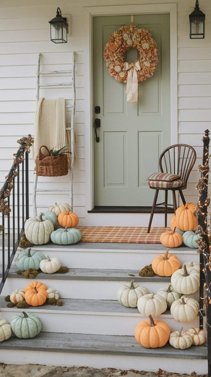 This one is charming with a capital C. Picture a soft sage-green door, a gingham layered rug in cream and pumpkin, and a tumble of fairy-tale pumpkins in pastel oranges, creams, and soft blues.