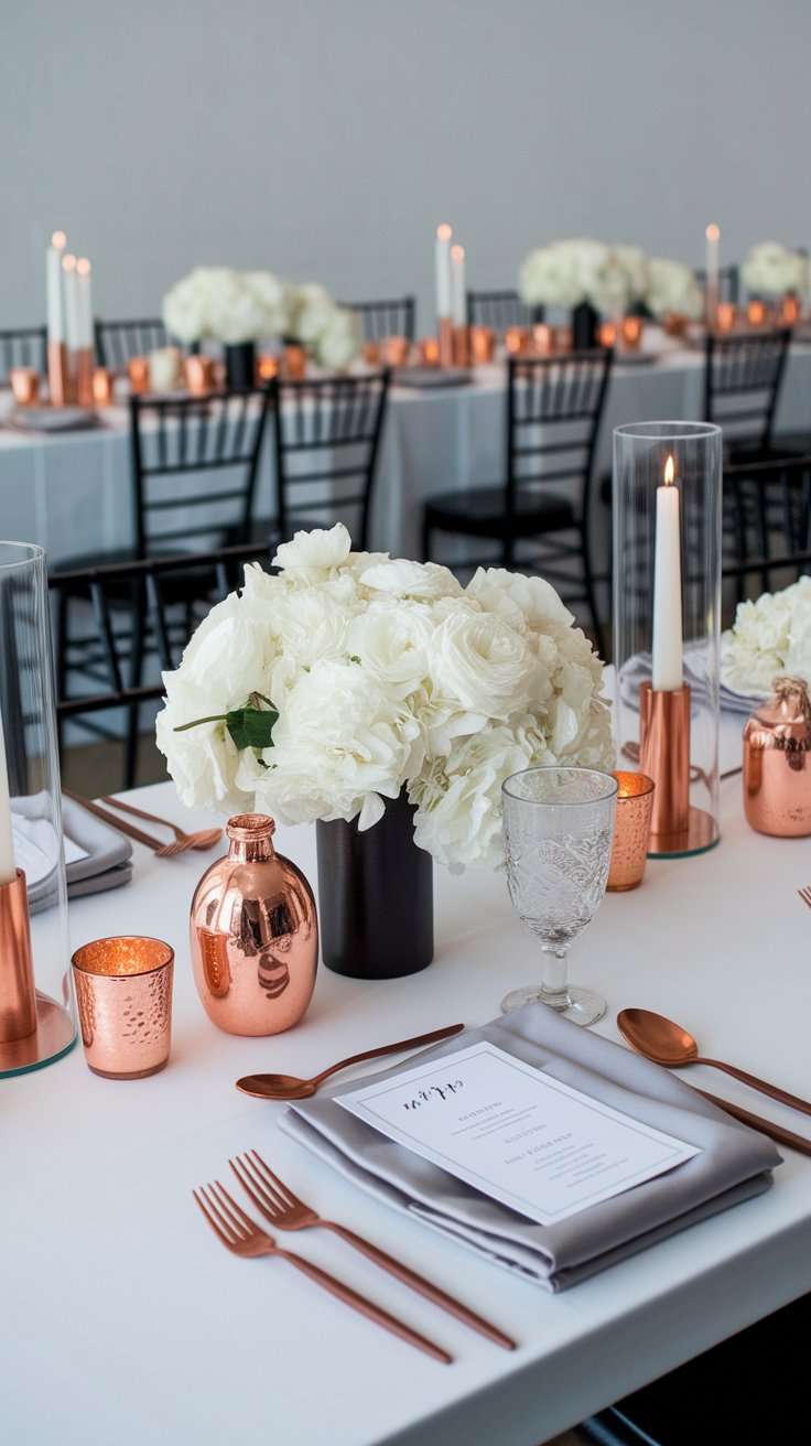 Keep the base neutral: white tablecloths, pale gray napkins, and black chairs. Introduce copper accents through flatware, napkin rings, bud vases, and geometric candleholders. Centerpieces stay structured: single-variety arrangements like white ranunculus or toffee roses in slim vases, spaced intentionally.